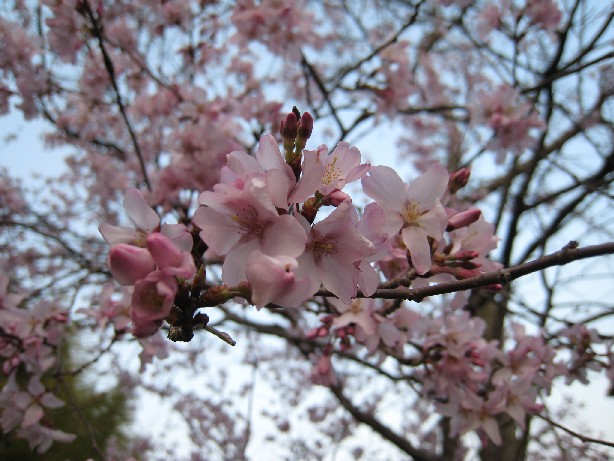 通勤路の途中にある小さな神社の桜。ピンク色がより濃くて花の形も小さくて可愛い。