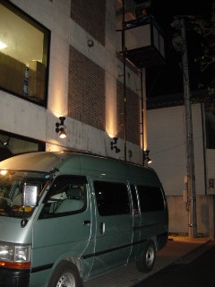 これがキャラバンサライの秘密兵器!! ちょっと見難いけど、3階にあるライブ会場への機材の搬入・出は右上に見えるゴンドラで行うのです。 もちろん、コブの機材一式もこのゴンドラに入れられ3階から下ろされてました。 いやぁ〜いいモン見たなぁ〜って妙に感心してしまいました。 これのおかげでワティ氏&木村君への負担もかなり少なかったのではないでしょうか?