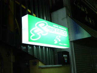 高知の街には立体看板が多い! カツオやクジラがビルの壁面にくっついていたり、屋根に乗っかっていたりしてとにかく、インパクト大!! そして、会場から帰るときに究極の立体看板を発見!! 3Dぶりだけでなくライティングもかなり凝っていて迫力満点。 |