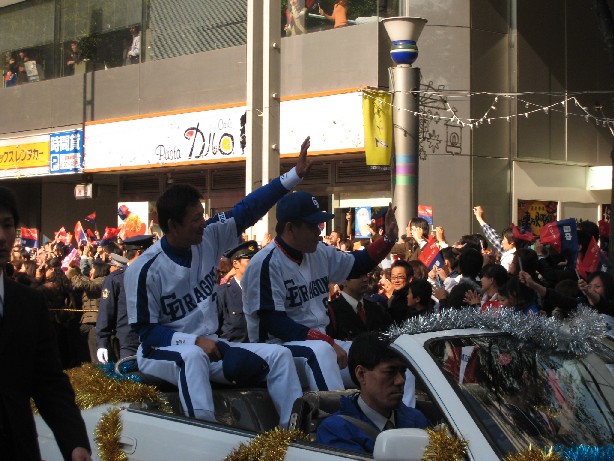 続くオープンカーには立浪さんと日本シリーズMVPに輝いた中村ノリさん!!