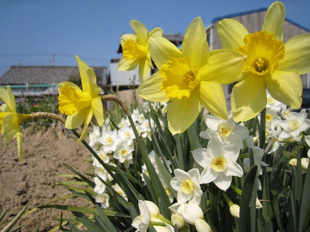 我が家の畑とお隣さんの境目にズラリと咲き誇っている水仙。(2007.3.21撮影)