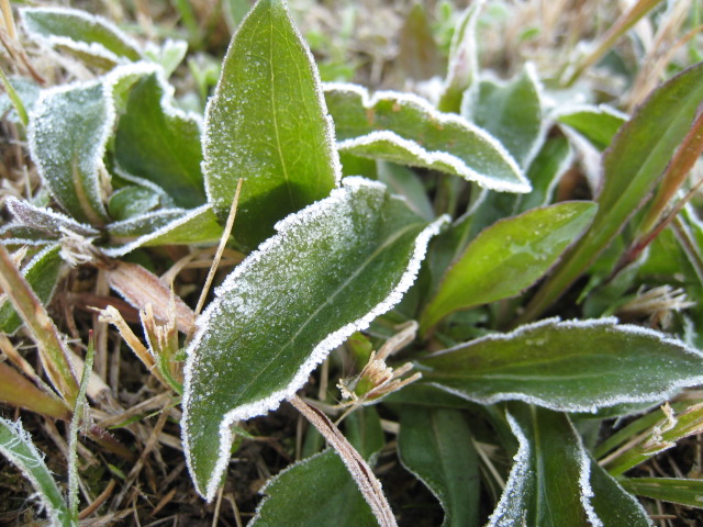 今シーズン初霜の早朝。足元のセイタカアワダチソウの葉っぱが霜化粧してました。(2007.11.24撮影)