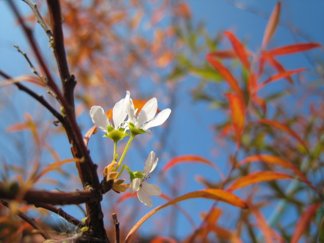 真っ赤に紅葉したユキヤナギにところどころ白いものが…良く見たら、花が咲いてる!