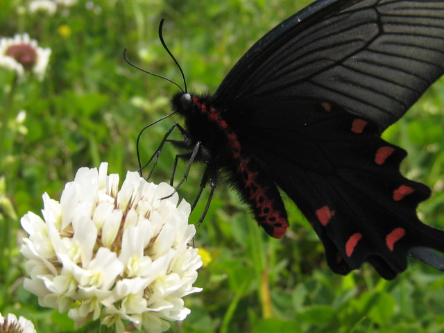 シロツメクサで蜜を吸うクロアゲハさん。黒に赤のコントラストがおしゃれだなぁ〜(2008.4.26撮影)